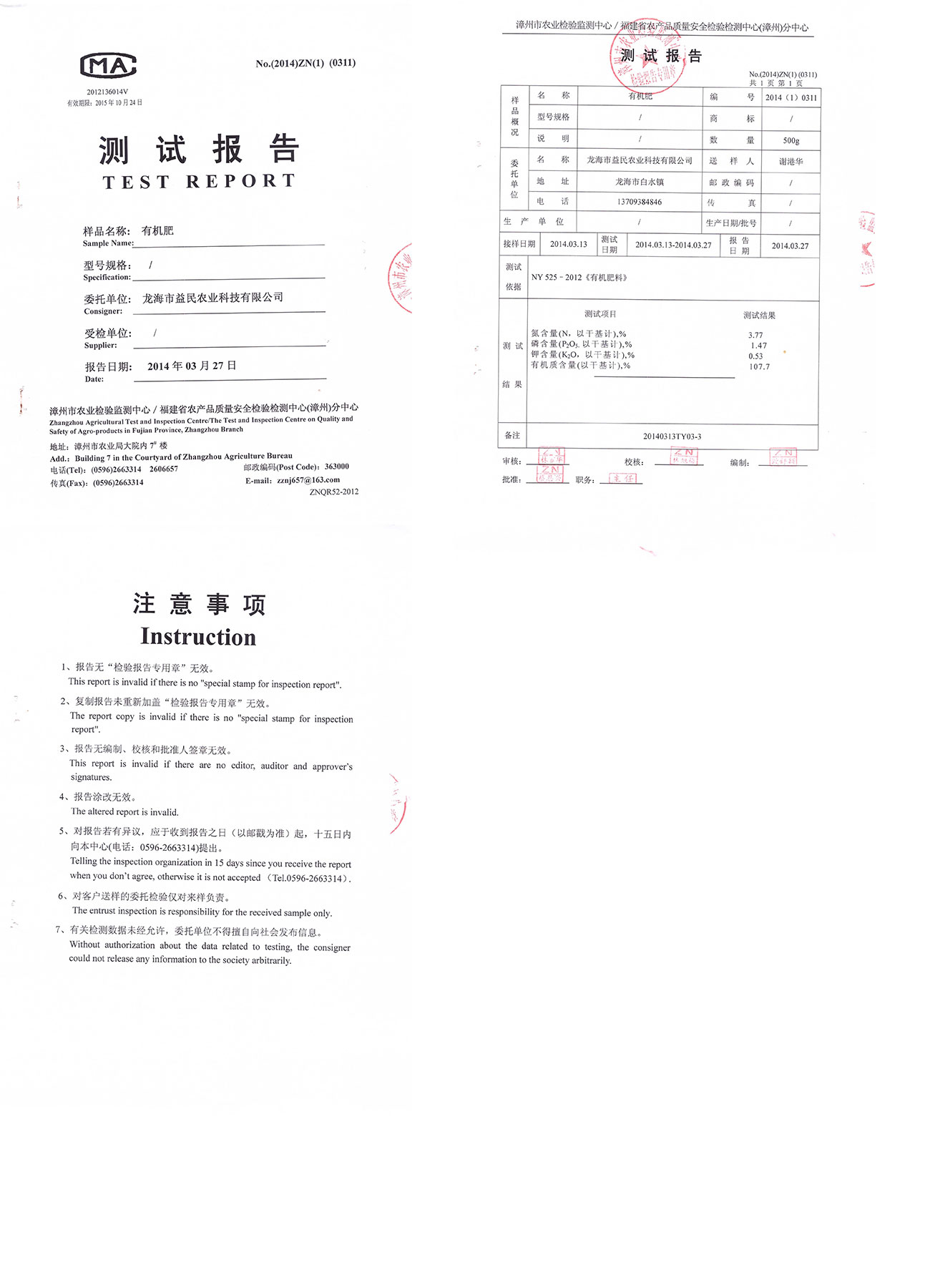 漳州市農(nóng)業(yè)檢驗檢測中心測試報告 有機肥2