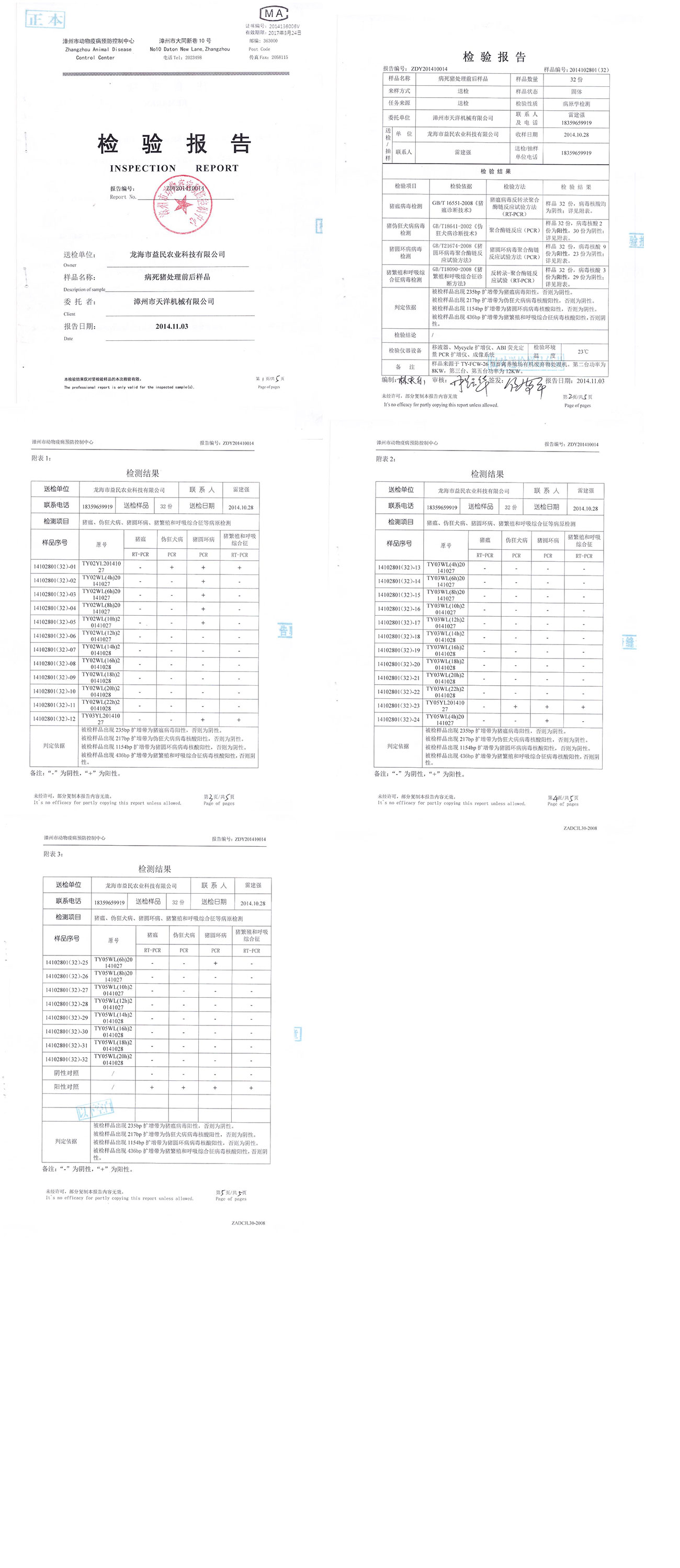 漳州市動物疫病預(yù)防控制中心檢驗報告--病死豬處理前后樣品檢驗